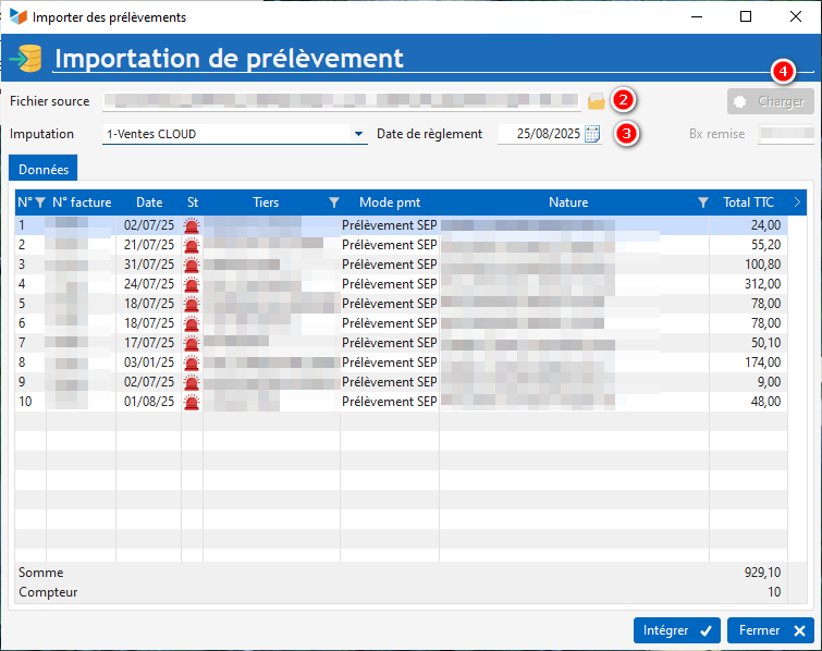 Dans la table, les factures mises au prélèvement et présentes dans le fichier apparaissent telles que sur le bordereau généré depuis Gestan