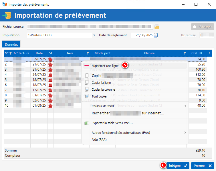 5 Sélectionner les lignes concernées une par une, clic droit > supprimer la ligne dans la cas de prélèvement rejettés. Cette manipulation exclut donc les factures rejetées de l'encaissement automatique. Les factures ne seront pas traitées comme encaissées et l'écriture ne sera pas générée également.