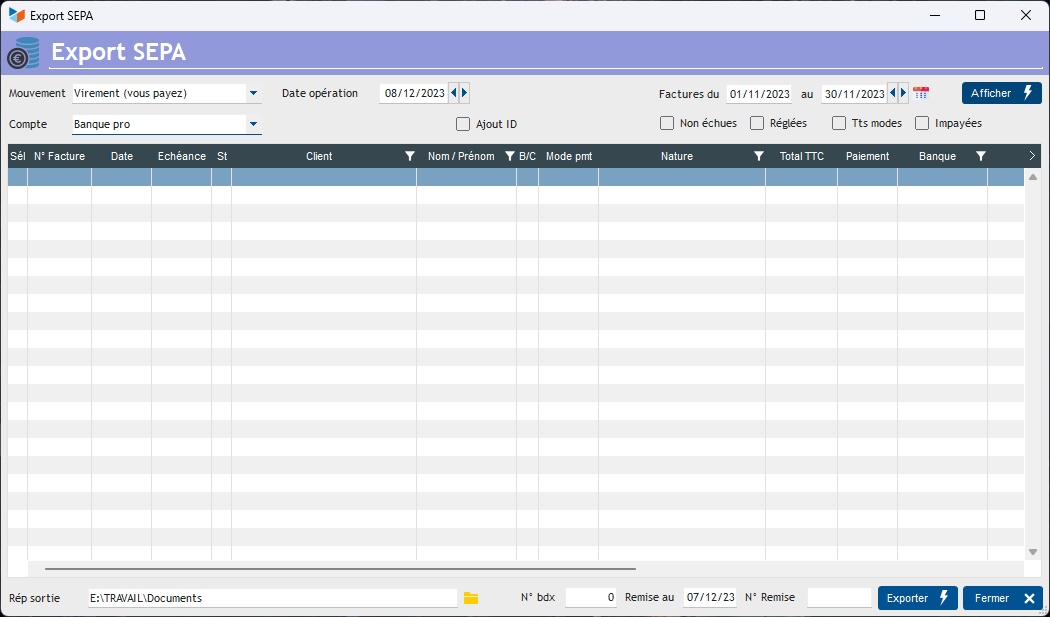 Quand vous cliquez sur le bouton Afficher, l'écran est alimenté avec les pièces correspondantes. Par exemple, si vous sélectionnez le type “Prélèvement”, toutes les factures en prélèvement non encore réglées de la plage de date sélectionnée sont affichées, avec les informations SEPA correspondantes.
