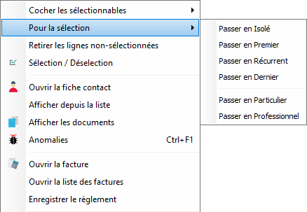 Le menu contextuel de la table permet de passer une sélection de prélèvement à la récurrence choisie.