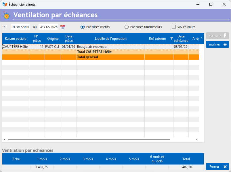 Cet écran permet de calculer la ventilation des échéances de factures client ou fournisseur.