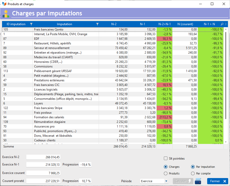 Les résultats sont calculés pour 3 périodes : l'exercice N-2, l'exercice N-1, et l'exercice N, ou selon la Période sélectionnée par la combo. Ils peuvent être affichés selon les imputations, ou selon les codes comptables.