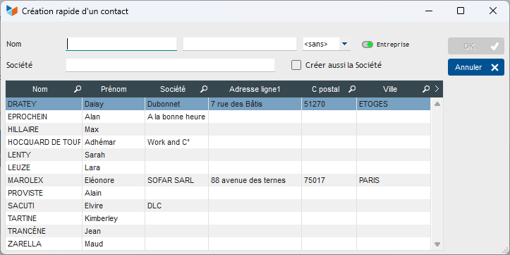 A chaque fois que vous saisissez une lettre, les noms qui sont déjà enregistrés dans votre base sont affichés dans la table juste en dessous. Si vous aviez déjà le contact dans la base, il suffit de double-cliquer dans la table pour le prendre en compte.