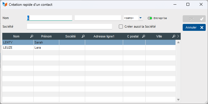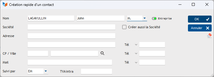 Si vous cochez la case Créer aussi la société, un enregistrement société sera crée concomitamment à la création du contact.