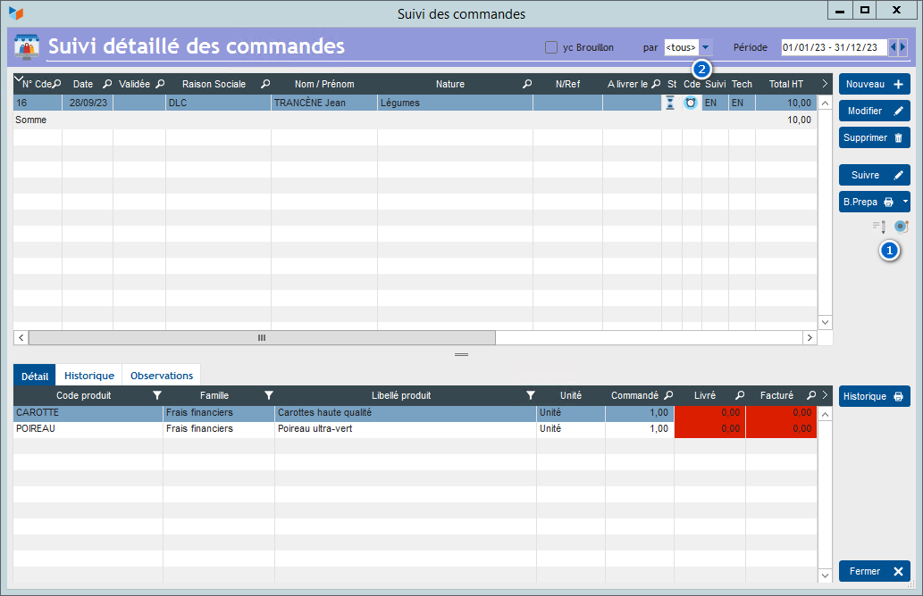 Prérequis : Avoir activé le suivi détaillé des commandes dans le paramétrage général (Version Entreprise).