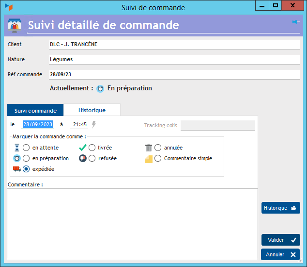 Une fois que vous avez transmis la commande au client, l'écran de suivi détaillé permet de lui affecter un statut secondaire :