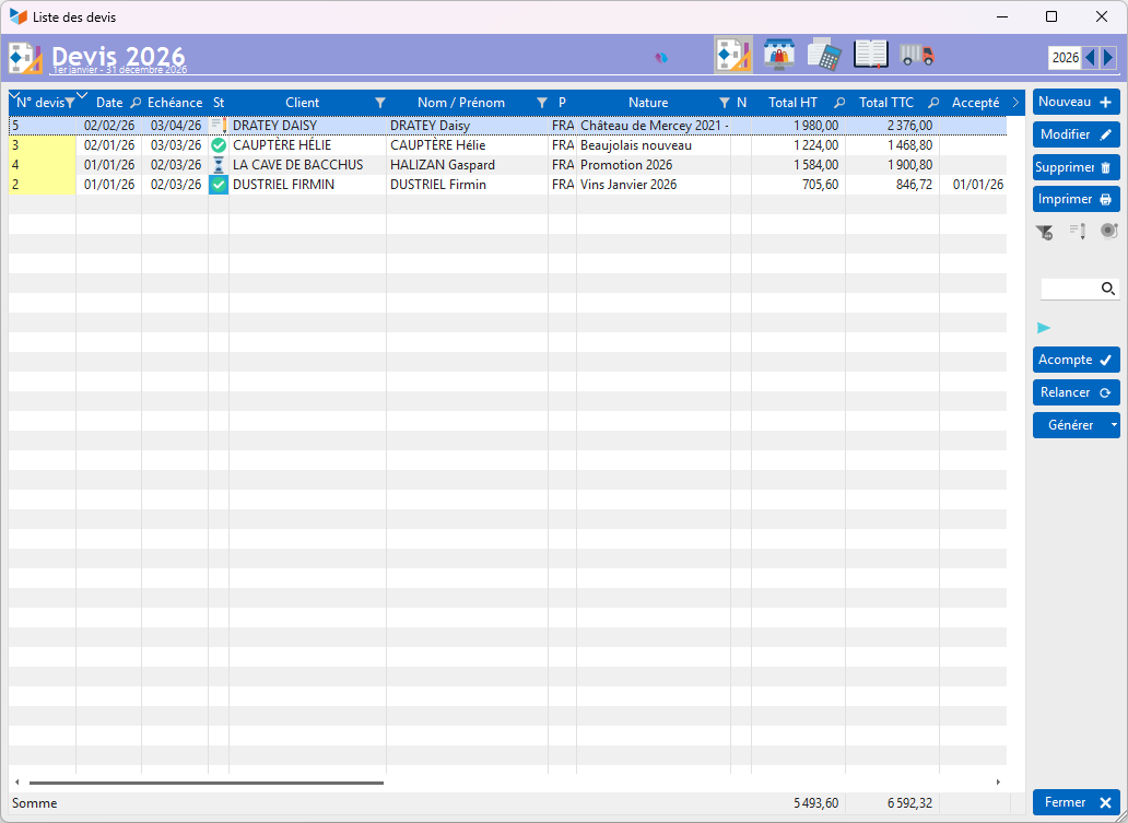 L'écran affiche la liste des devis du mois, ou de l'exercice, selon paramétrage de l'affichage.