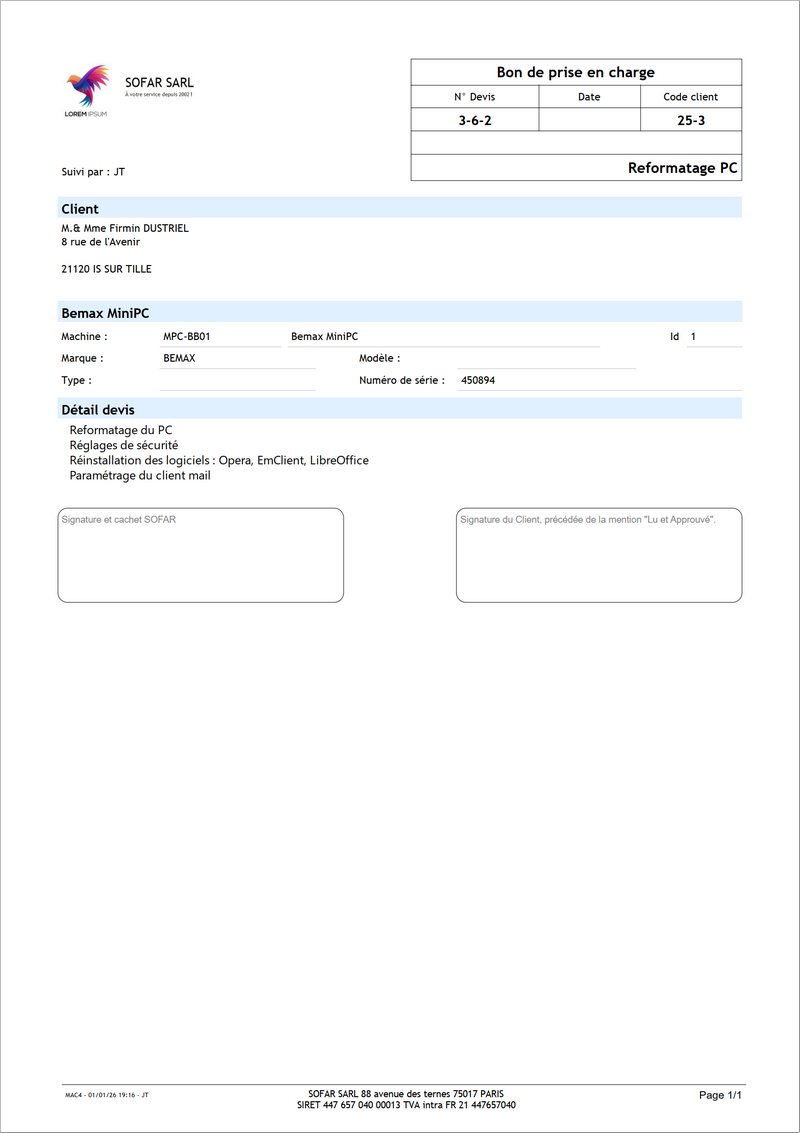 Cet état est notamment utilisé lorsque vous devez faire une opération de maintenance sur un matériel : si le devis est lié à la machine, l'état MAC4 imprime les caractéristiques du matériel, ainsi que l'opération concernée par le devis, détaillée dans les notes de ce dernier.