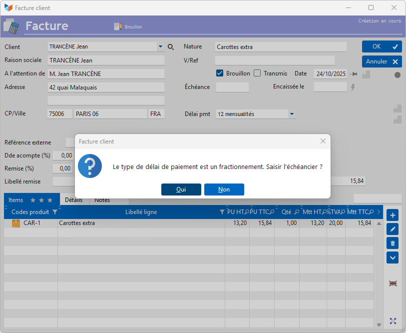 Lorsque vous indiquez, pour un devis, une commande ou une facture, un délai de paiement de type “Fractionnement”, Gestan vous propose de créer de suite un échéancier de facturation pour le document de vente en cours.