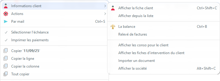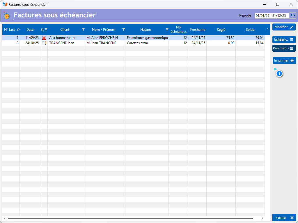 Il est également possible d'afficher l'ensemble des documents de vente auxquels un échéancier est rattaché, via le menu Commerce → Factures → Factures sous échéancier.