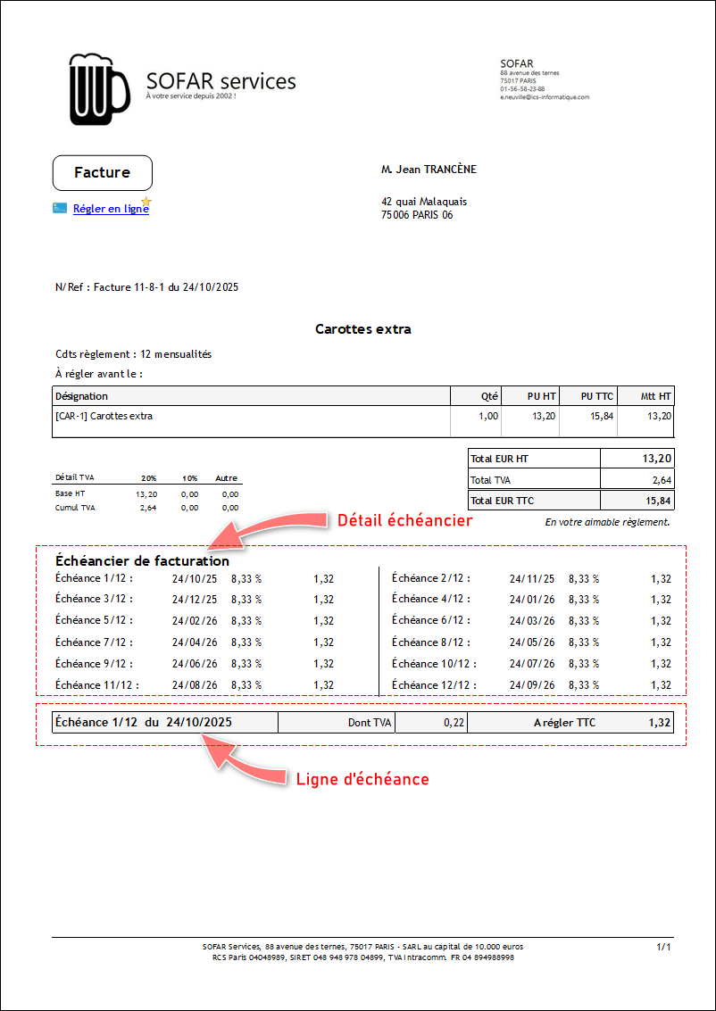 Sur les factures auxquelles sont rattachés des échéanciers, ces informations pourront être imprimées en pied de page, comme ci-dessous. Il est possible, selon les options du paramétrage, d'imprimer la ligne d'échéance, ou le détail de l'échéancier.