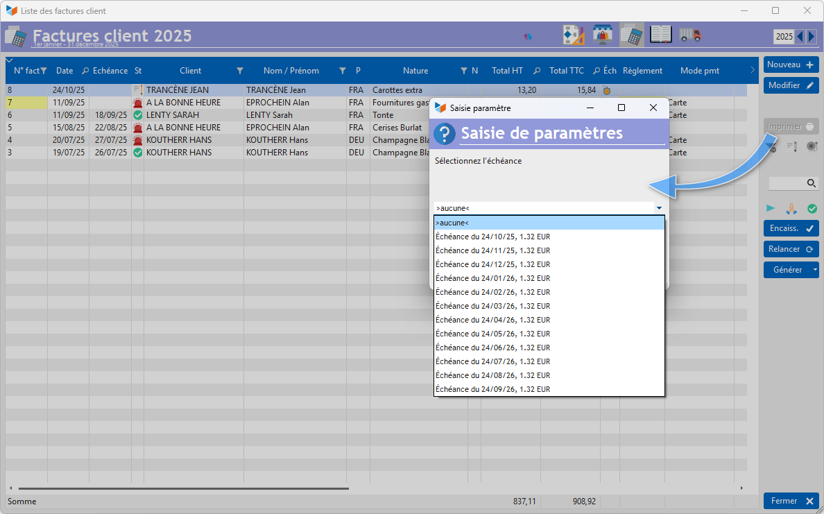Au moment de l'impression (selon paramétrage), un écran intermédiaire vous invitera à sélectionner l'échéance concernée.
