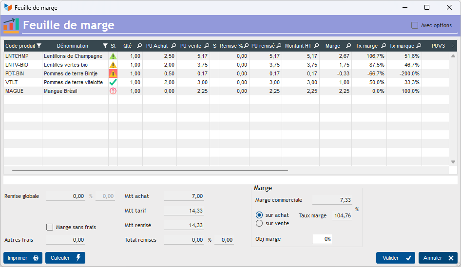 Le Montant de la marge est alors recalculé par ligne, ainsi que le statut de la ligne (colonne St).