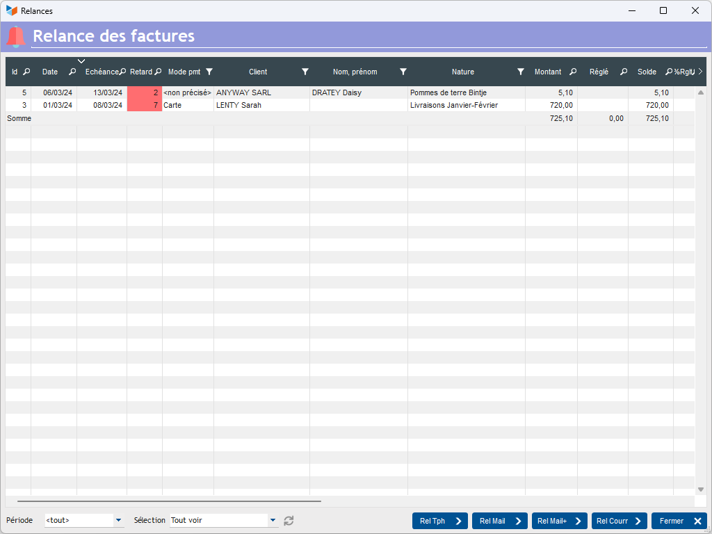 Le bouton Rel Tph va enregistrer une action de type téléphone dans le dossier client. Le bouton Rel mail va générer un mail de relance, avec retransmission de la facture, tandis que le bouton Rel mail+ va réaliser la même action, avec un message plus insistant. Enfin, le bouton Rel courr va déclencher l'édition d'un courrier.