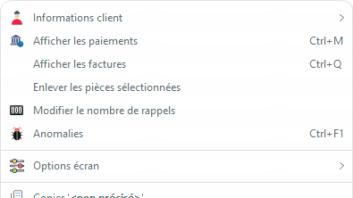 Dans les options écran, l'option d'affichage des pièces non échues permet d'afficher aussi les pièces qui ne sont pas encore à relancer, tandis qu'il est possible de ne pas afficher les pièces dont le mode de paiement est “prélèvement”, puisque l'exécution du prélèvement vous échoit.