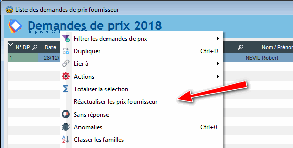 Accès : clic droit sur l'écran liste des commandes ou factures fournisseur → option Réactualiser les tarifs fournisseur.