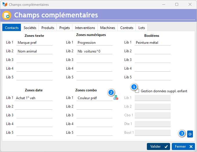 Pour les fichiers majeurs de Gestan (contacts, produits, machines, etc), il est possible de gérer des données supplémentaires, ne faisant pas partie des données natives.