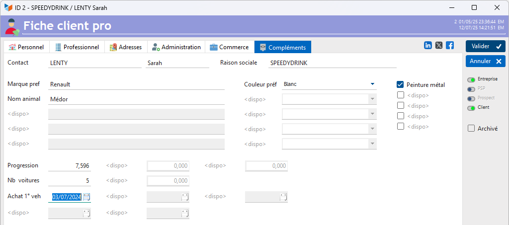 Avec le paramétrage indiqué ci-dessus, un onglet Compléments sera affiché sur la fiche contact, comme ci-dessous.