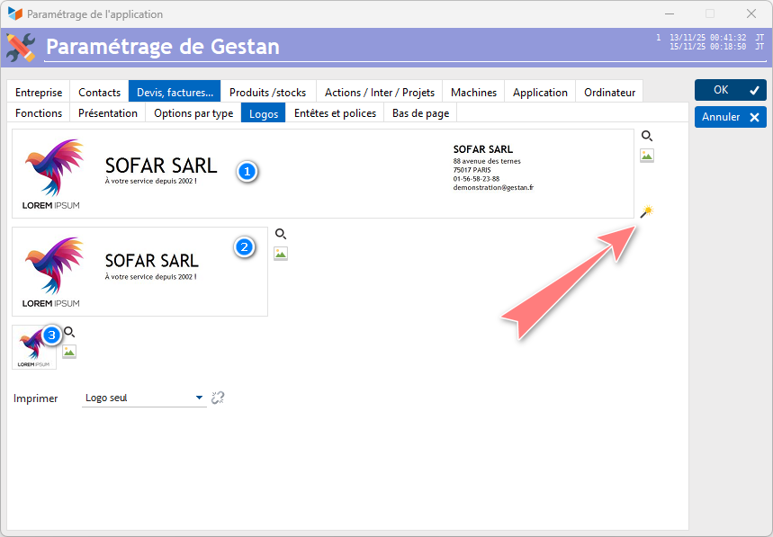 Les boutons 1 permettent de sélectionner l'image de votre logo, ou d'en sélectionner un parmi une liste proposée par Gestan. Choisissez de préférence une image au format carré pour ce logo, ou un format rectangulaire, le plus grand côté du rectangle étant horizontal.
