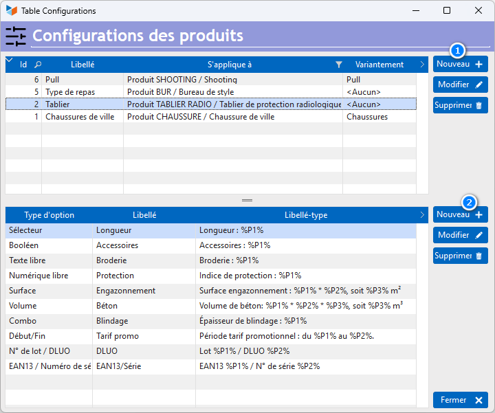 Le bouton Nouveau de la partie basse 2 permet de créer un nouvel élément pour le configurateur sélectionné.