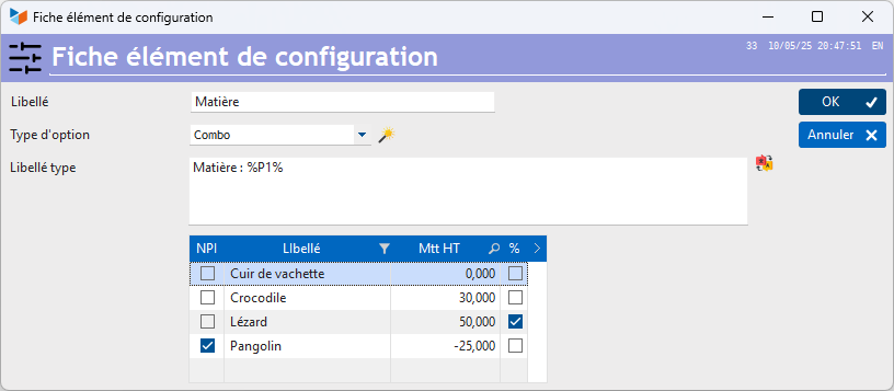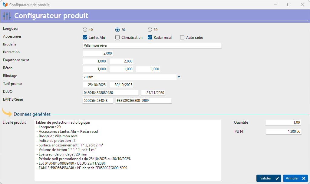 Lorsque, en création de devis, commande, facture, etc, vous allez sélectionner un produit concerné par un configurateur, un écran intermédiaire permettra de sélectionner la configuration de produit que vous retenez, avec les impacts éventuels sur le tarif et sur les quantités.