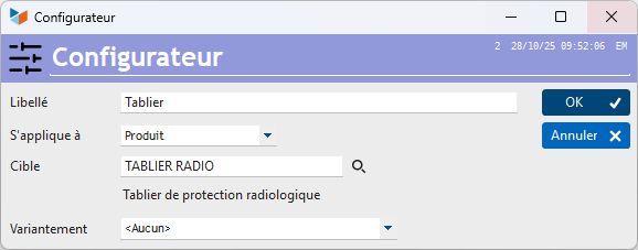 Ici, il s'agit d'un configurateur nommé “Tablier”, qui va s'appliquer à un produit, “Tablier Radio”. Via S'applique à, vous pouvez préciser que le configurateur s'applique à un produit, ou à une famille ou sous-famille de produit.