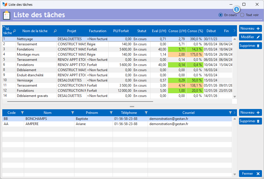 Le sélecteur 1 permet d'afficher seulement les tâches en cours, ou toutes les tâches.