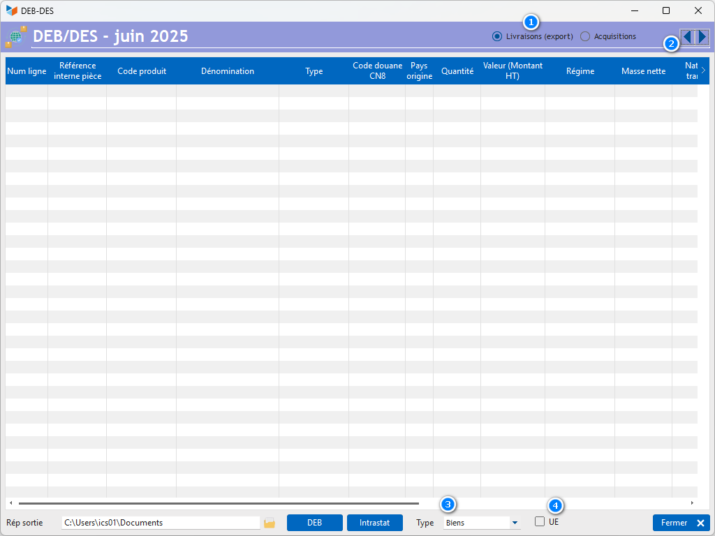 Le sélecteur 1 permet de sélectionner le type d'extraction : soit les données d'exportation (option Livraisons), soit les données d'importation (option Acquisitions). Le spin 2 permet de sélectionner le mois d'affichage.