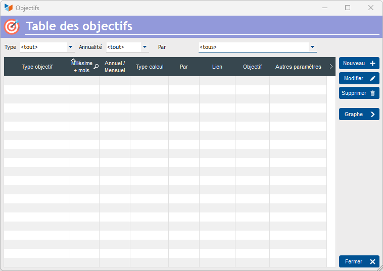 Les objectifs annuels sont calculés à partir d'un mois de l'année. Par exemple, si votre comptabilité démarre le 01/09, vous pouvez calculer les objectifs annuels du 1er septembre au 31 août. Ce mois de démarrage est fixé à l'aide de la combo en haut et à droite de l'écran liste des objectifs.